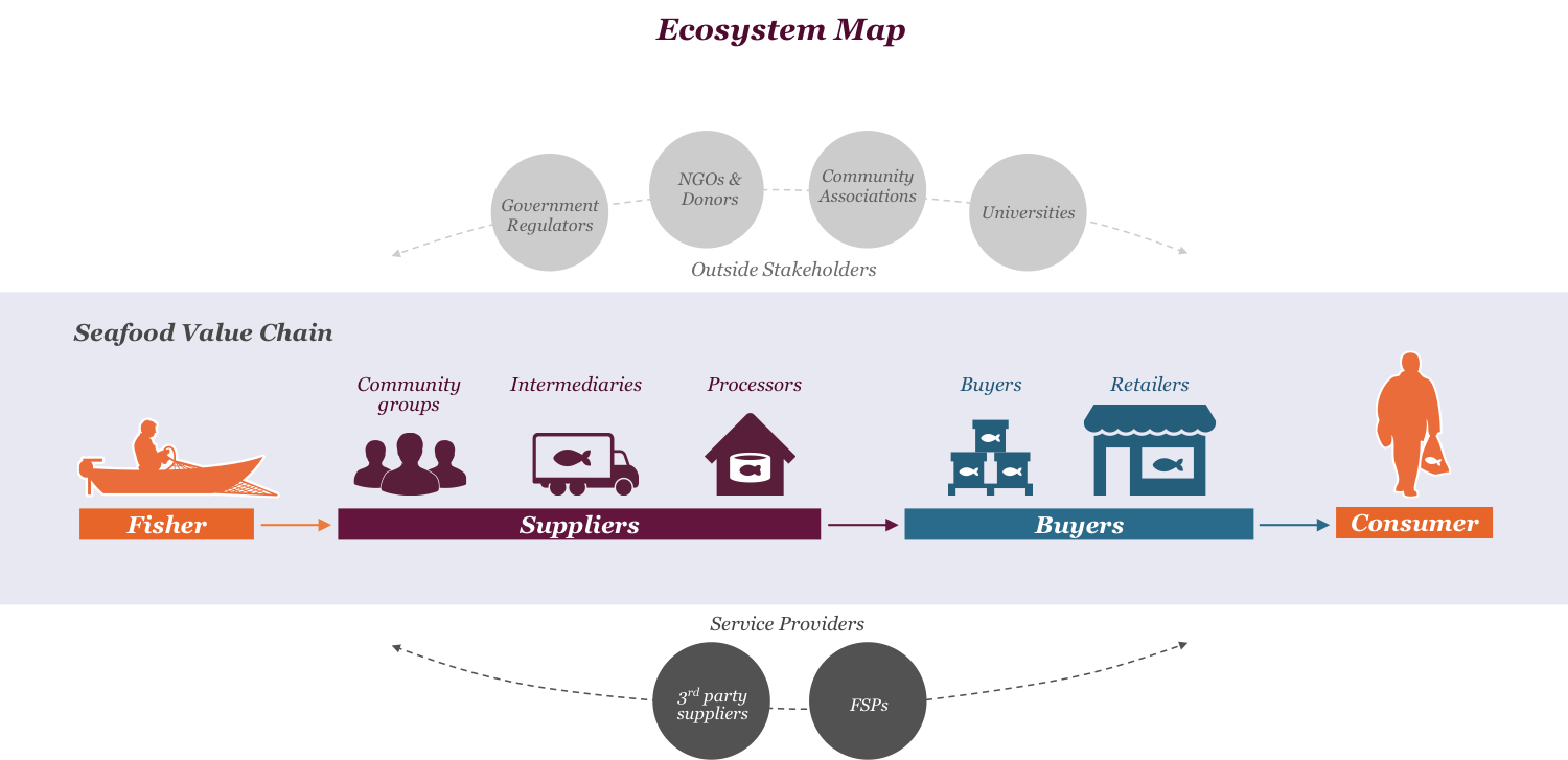 Through participatory and immersive human centered design, Dalberg Design worked with fishers, government and industry stakeholders to create innovative solutions for small-scale fisheries management. We prototyped, tested and refined solutions anchored in deep insights into fisher values, needs, behaviors and motivations. We used ecosystem mapping, value-chain analysis and business modeling to create financial models, success metrics and staging plans to support the piloting of the most promising solutions.