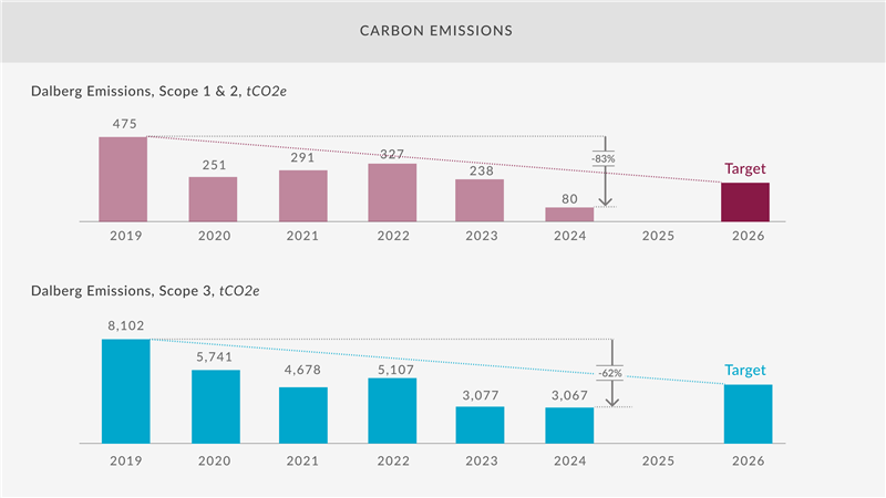 We continue to work toward our targets for 2026, which include 55% reductions in both scope 3 greenhouse gas (GHG) emissions and scope 1 and 2 GHG emissions. In the last reporting cycle, Dalberg cut its scope 1 and 2 carbon emissions by 83% and its scope 3 emissions by 62% compared with our 2019 reference year.