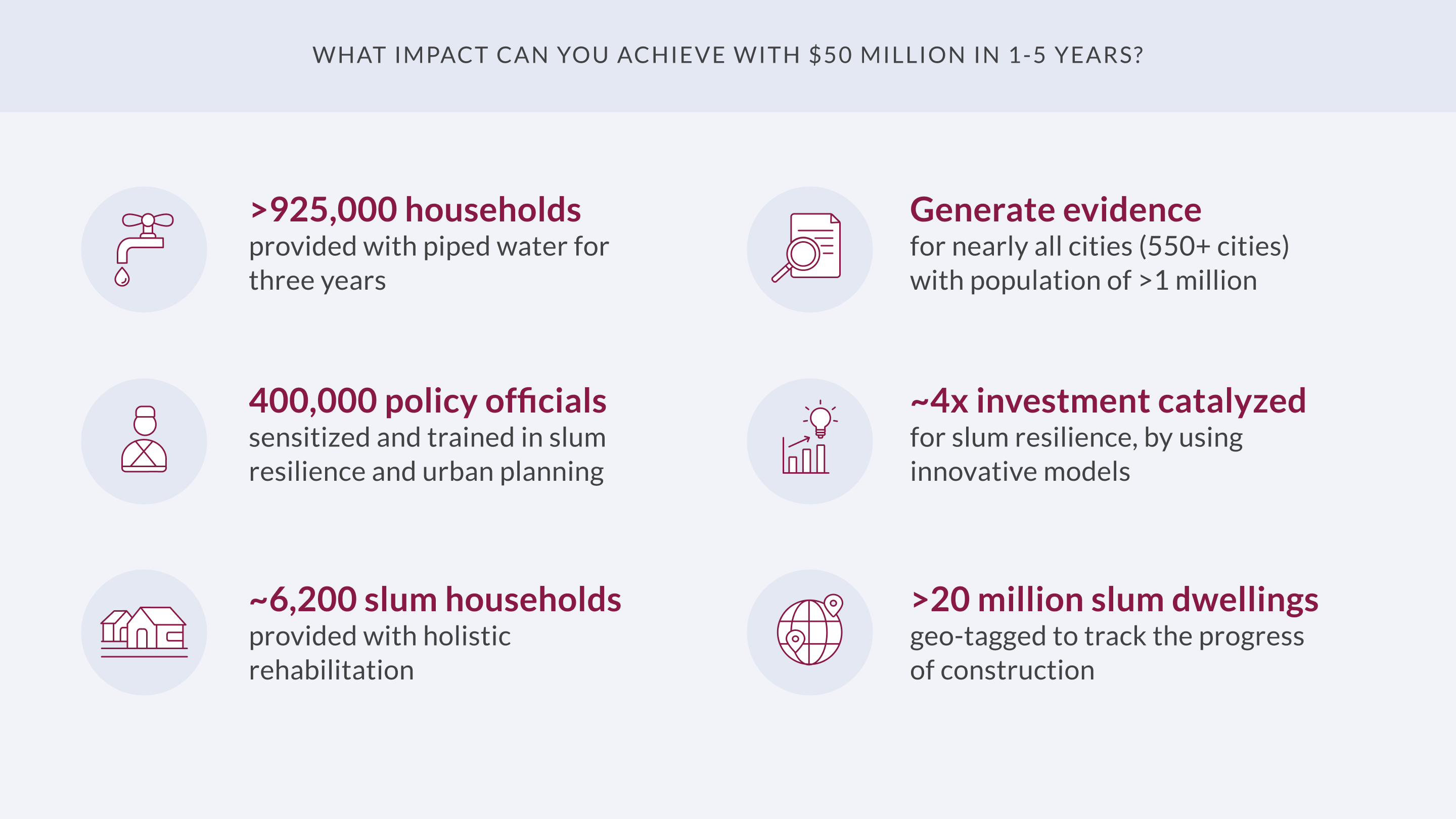 As more robust evidence regarding outcome measurement emerges, there is an opportunity to utilize blended finance strategies that incorporate innovative funding mechanisms and vehicles. By aligning commercial and social objectives, blended finance creates synergies that benefit slum resilience initiatives. Small investments can yield significant results. For instance, a $50 million investment can map over 20 million households, enhance public officials’ capabilities, and produce valuable data that can be leveraged for slum redevelopment.