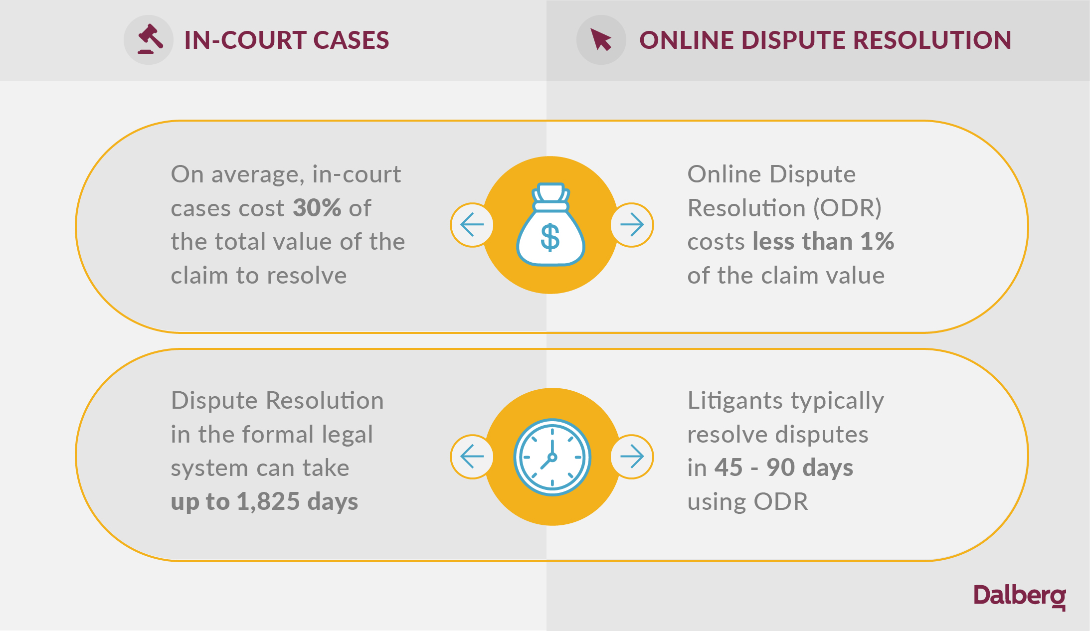 The use of technology simplifies and expedites the process, and reduces costs significantly. And where litigants typically resolve disputes in 45-90 days using ODR, resolution in the formal legal system can take up to 1,825 days.