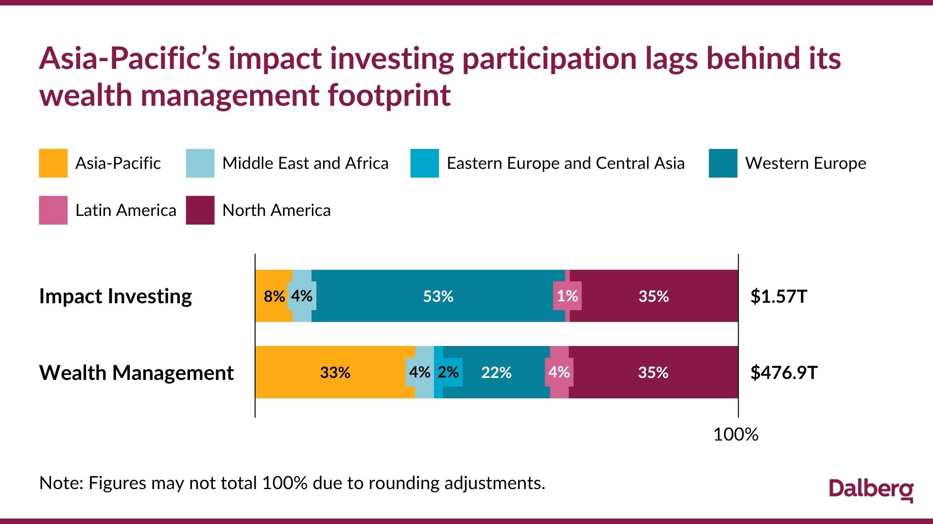 Private impact investing represents a much larger capital pool than either ODA or philanthropy, with approximately $80 billion in assets under management (AUM) in Asia. However, there is still considerable room for growth. Despite Asia accounting for roughly one-third of global wealth management assets, it only represents 5% of the $1.57 trillion global impact investing market—a significant underrepresentation.