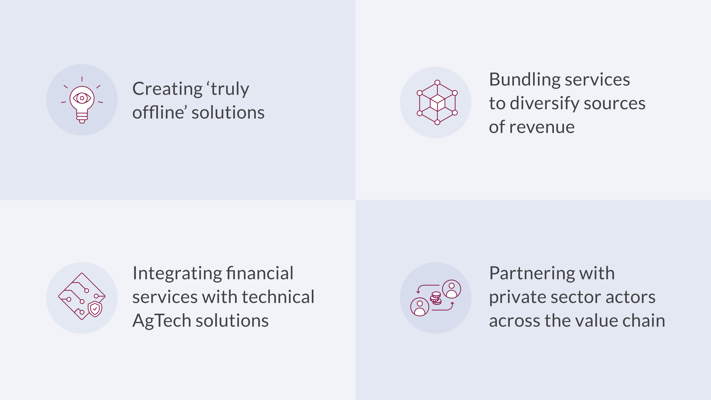 - Integrating financial services with technical AgTech solutions. This approach can be carried out either directly or through partnerships with financial institutions. It allows for an increase in uptake due to SHF’s high capital needs and circumvents their limited access to the formal financial sector caused by a lack of credit history.