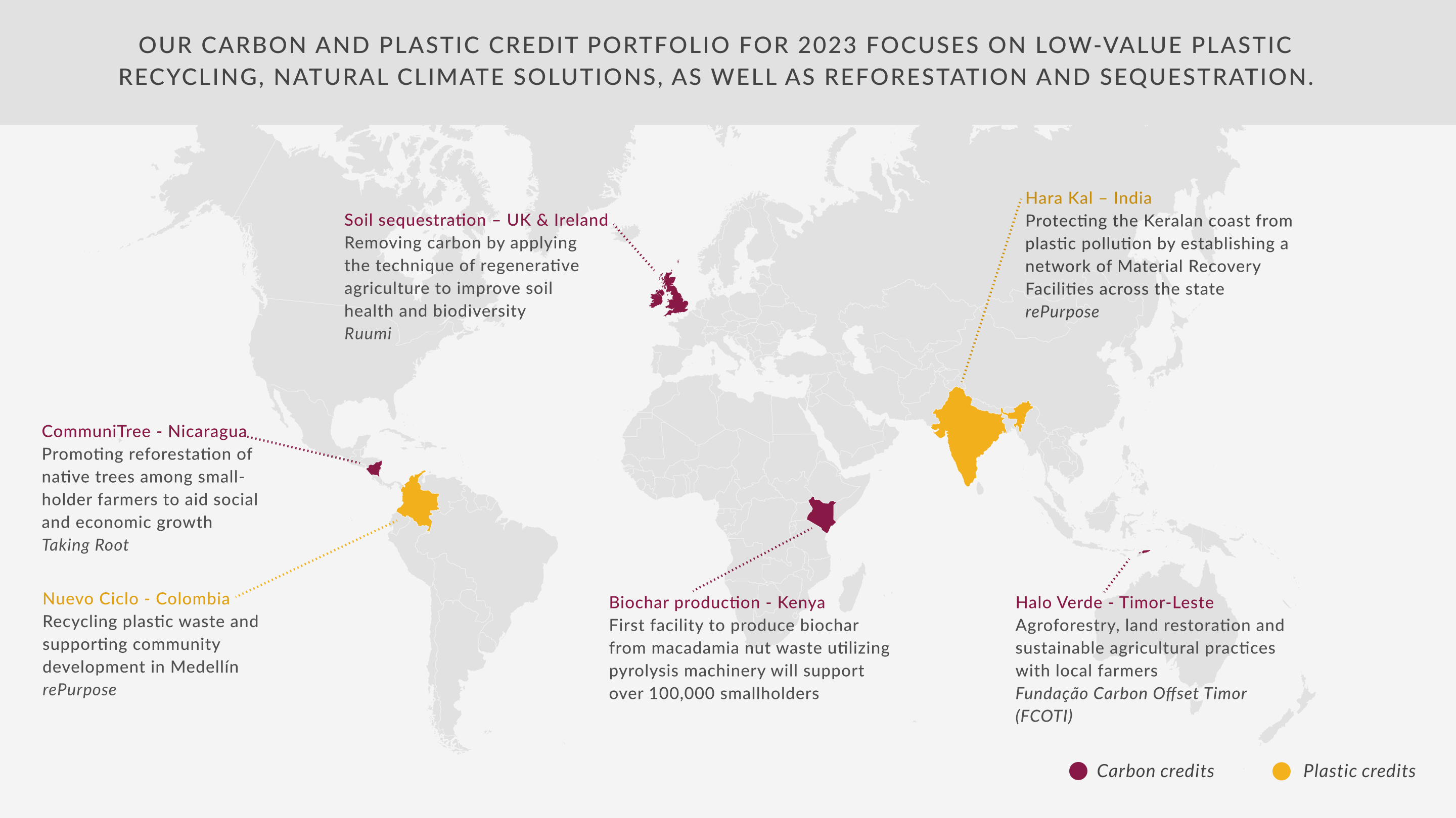 Our carbon and plastic credits provide essential funding for impactful projects centered on recycling of low-value plastic (where the costs of collecting and processing plastic waste are higher than the revenue generated from sale of the recovered plastic) as well as reforestation and sequestration. Our 2023 projects are on the map below.