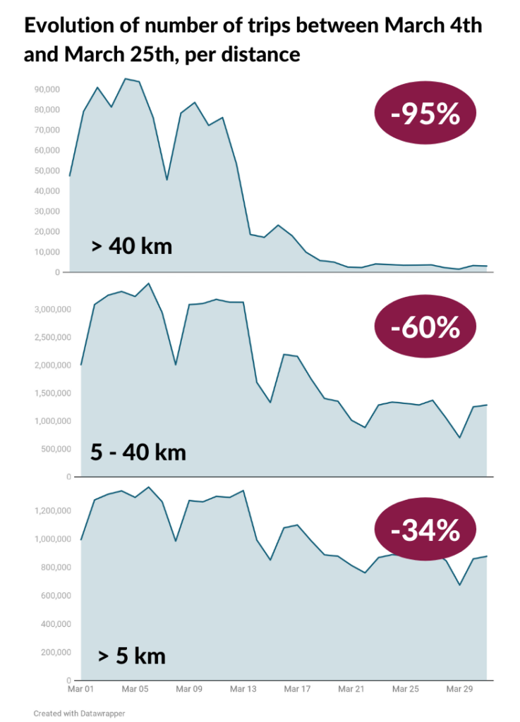 DDI developed and piloted a prototype in Belgium, where it has since been mandated to directly support the government’s pandemic decision making on a weekly basis. For instance, the data toolkit helped the Belgian government decide whether to relax or strengthen the lock-down of the country in mid-March 2020. Based on DDI’s analysis, the Government decided to keep the lockdown as it was given that the analysis and toolkit showed existing measures had already provided a measurable impact on individual mobility patterns.
