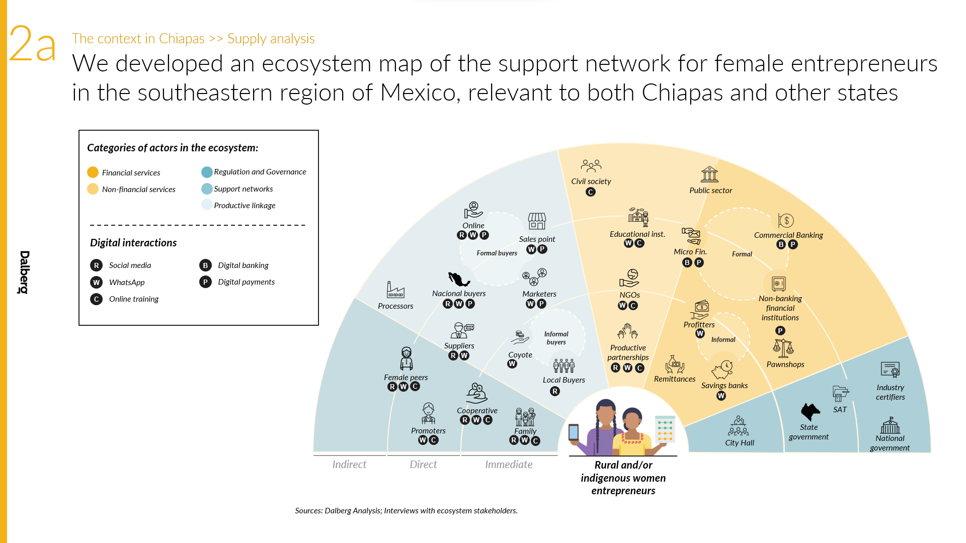 We then did a complementary quantitative and desk research study to understand the demographic, economic, and infrastructure differences between five states in the South-East. Through this analysis, we were also able to gain a clearer picture of the financial and non-financial products and services offered in each state, which allowed us to identify gaps and opportunities for Pro Mujer to serve these markets successfully. Dalberg developed detailed state characterizations and ecosystem maps of the existing financial and non-financial products and services offered by state.