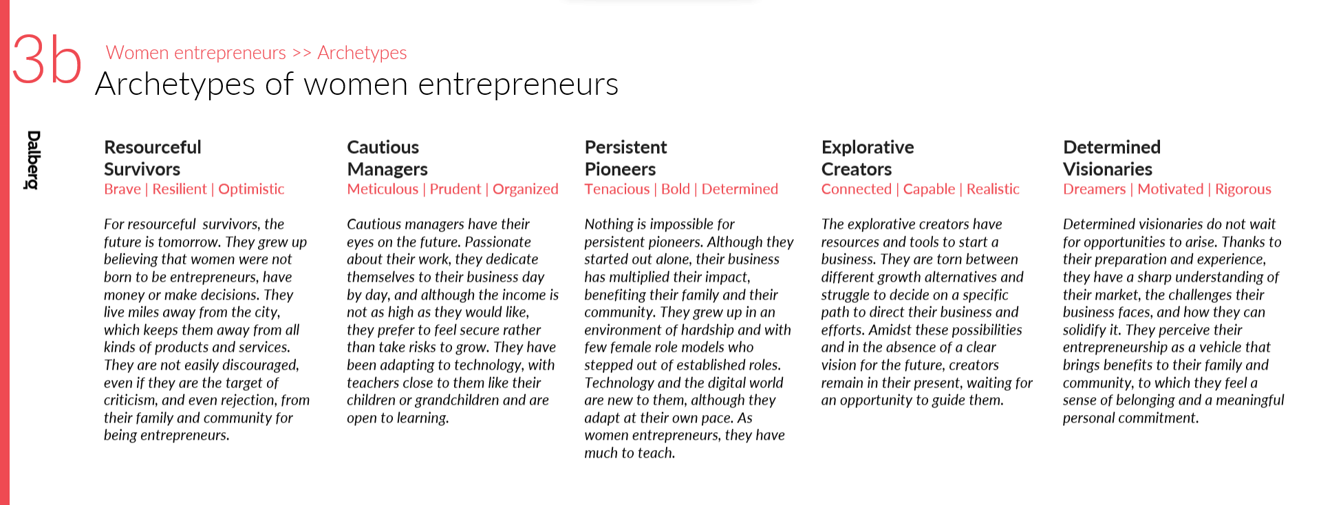Using Human-Centered Design (HCD) tools, the Dalberg team learned the perspectives of different actors in the region, both women entrepreneurs, and the local service providers they might interact with. This research allowed us to delve into household finances, the experience of entrepreneurship, the challenges of running a business in rural areas, and the future aspirations of fifty women entrepreneurs. Using a set of segmentation variables, we developed archetypes to differentiate the distinct types of women entrepreneurs in the region and their specific financial and non-financial needs.