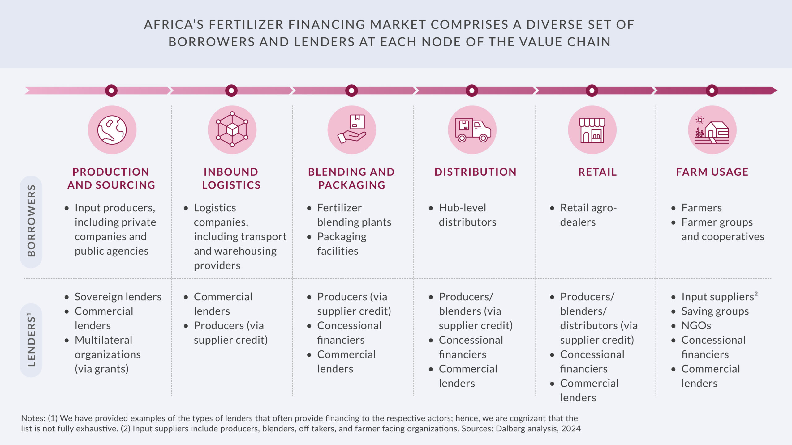 Fertilizer financing challenges primarily affect local blenders, distributors, and smallholder farmers—the key players in the fertilizer value chain, which includes production, inbound logistics,[1] blending and packing, distribution, retail, and farm usage. While producers and inbound logistics typically receive competitive financing from banks, local blenders and distributors face expensive debt and cumbersome processes to access financing. At the end of the value chain, retailers and smallholder farmers often have the least access to financing, relying on savings and informal channels.