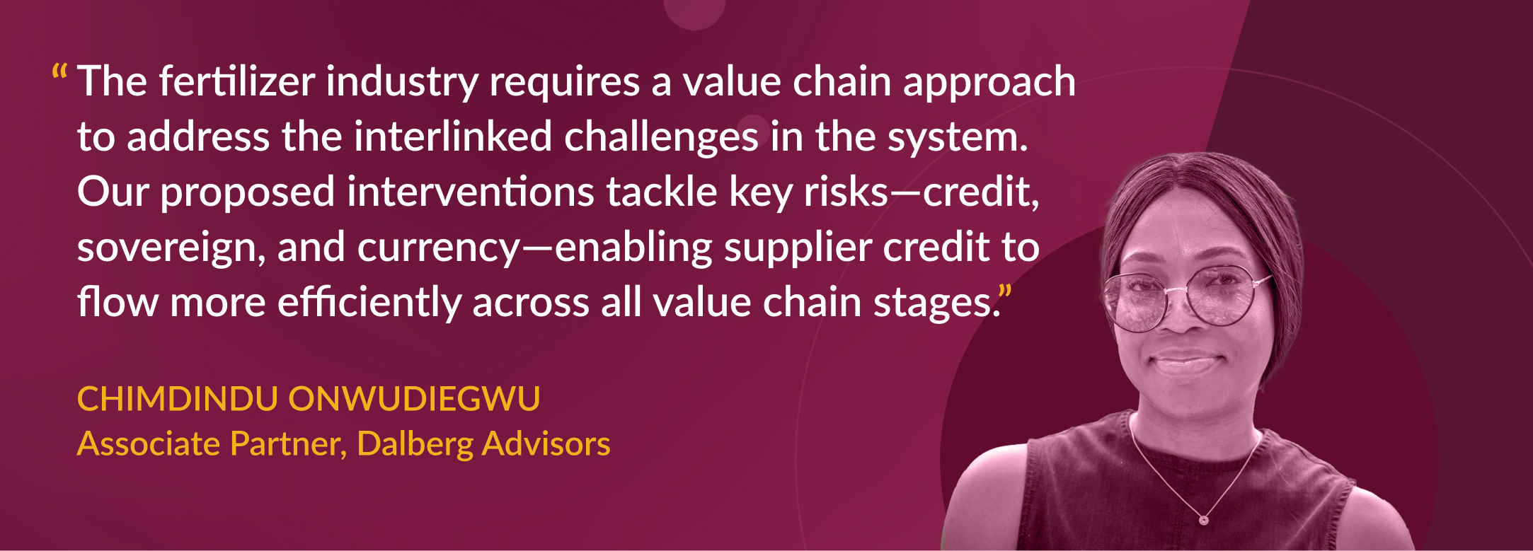 Dalberg’s recommendations are grounded in extensive research—including interviews with approximately 40 stakeholders across the fertilizer value chain, from producers to farmers, as well as banks—and existing mechanisms like AFFM and AFAP. A key takeaway from our work with Sustain Africa is that addressing fertilizer financing challenges requires tackling risks at every stage of the value chain. Solutions focusing on just one part, such as production, will not work unless we create financing opportunities for local blenders, distributors, and retailers. Second, while blended finance can be a powerful catalyst for unlocking capital, to be effective, it must be designed to incentivize participation actively. We can encourage financial institutions to lend to previously underserved market segments by offering return enhancements and guarantees.