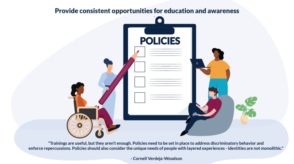 “Encourage a culture of critical love and organic education. Organizations should commit to ongoing training and support through creating safe spaces for informed conversations.”