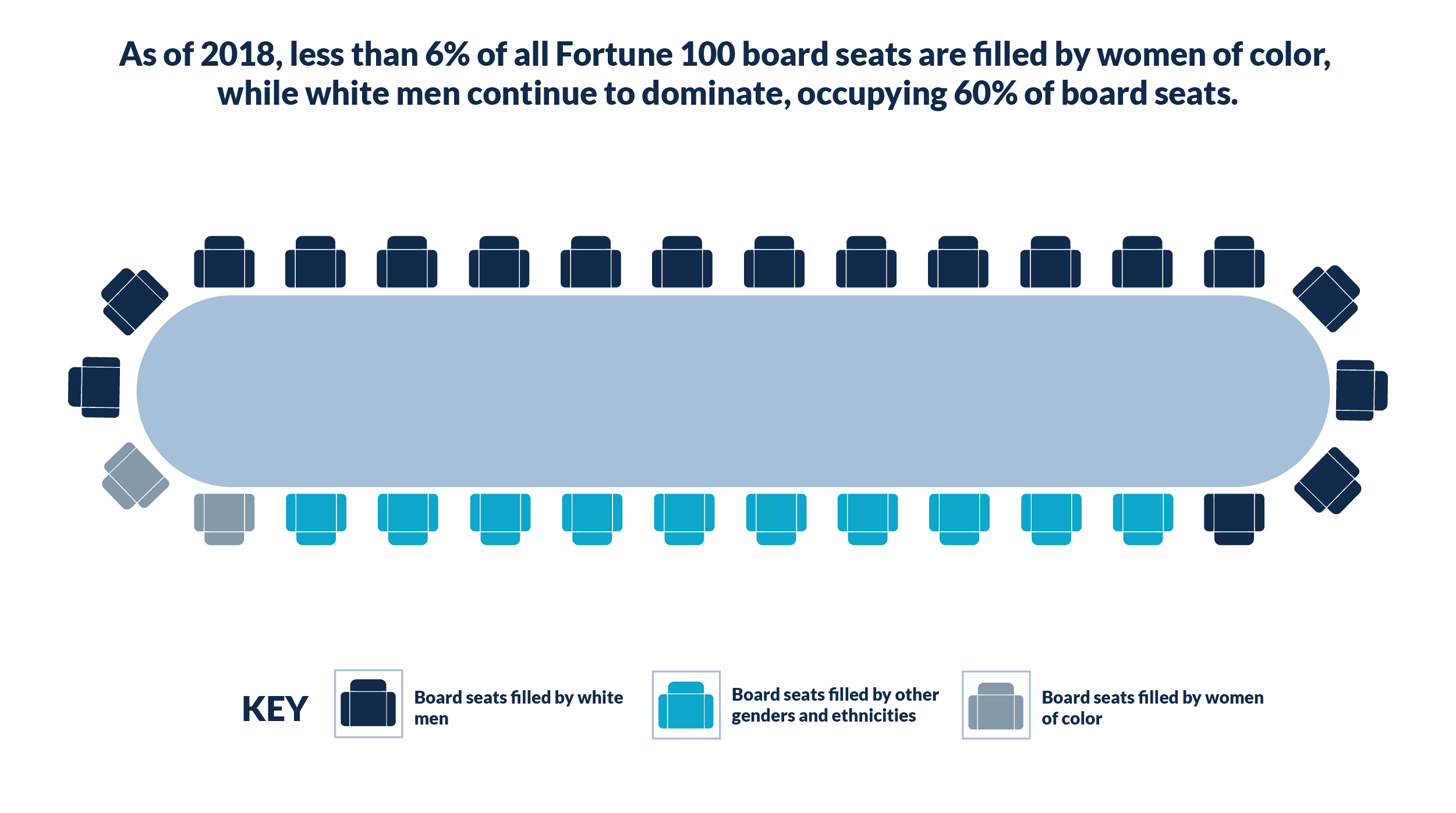Some progress on D&I has been made in recent years, but data reveals that commitments to action are still lacking. As of 2018, less than 6% of all Fortune 100 board seats were filled by women of color, while white men continue to dominate, occupying 60% of board seats.[3] Additionally, fewer than 15 Fortune 100 companies have a C-suite that is comprised of one-third or more of non-white executives.[4]