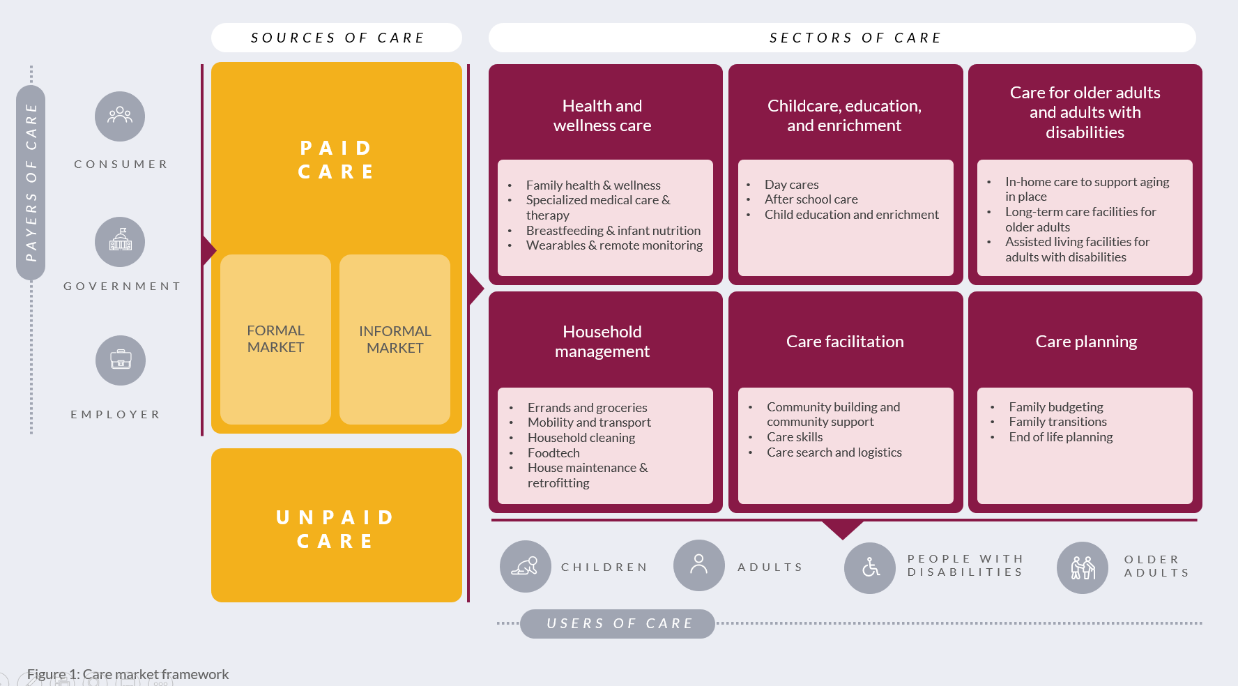We do not have viable care infrastructure in the US today. Care infrastructure refers to the policies, products, and services that support childcare, eldercare, and other caregiving needs. The care infrastructure in the US is a patchwork of unpaid, informal, or poorly paid work supported by a combination of individual, employer, and government payments. It covers a range of different care needs (See Figure 1 below) from direct care provision, to care planning for children, to in-home care for older adults.